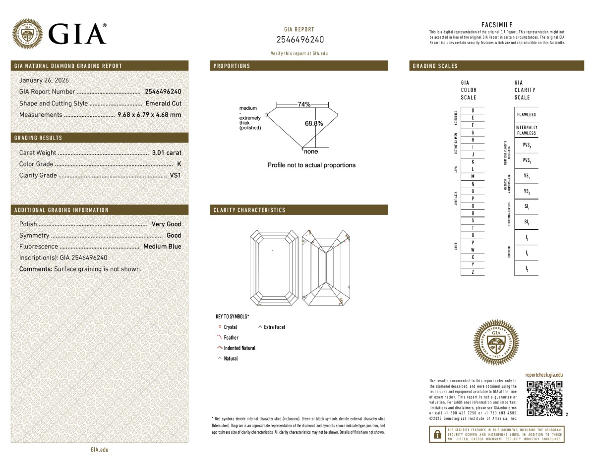 Emerald Shape, 3.01 Carat, K Color, VS1 Clarity