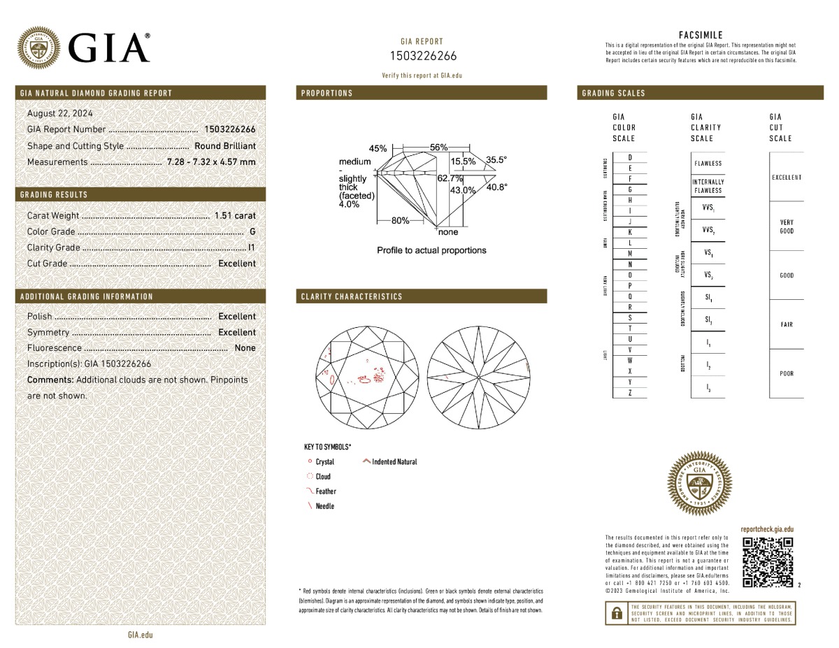 Round Shape, 1.51 Carat, G Color, I1 Clarity