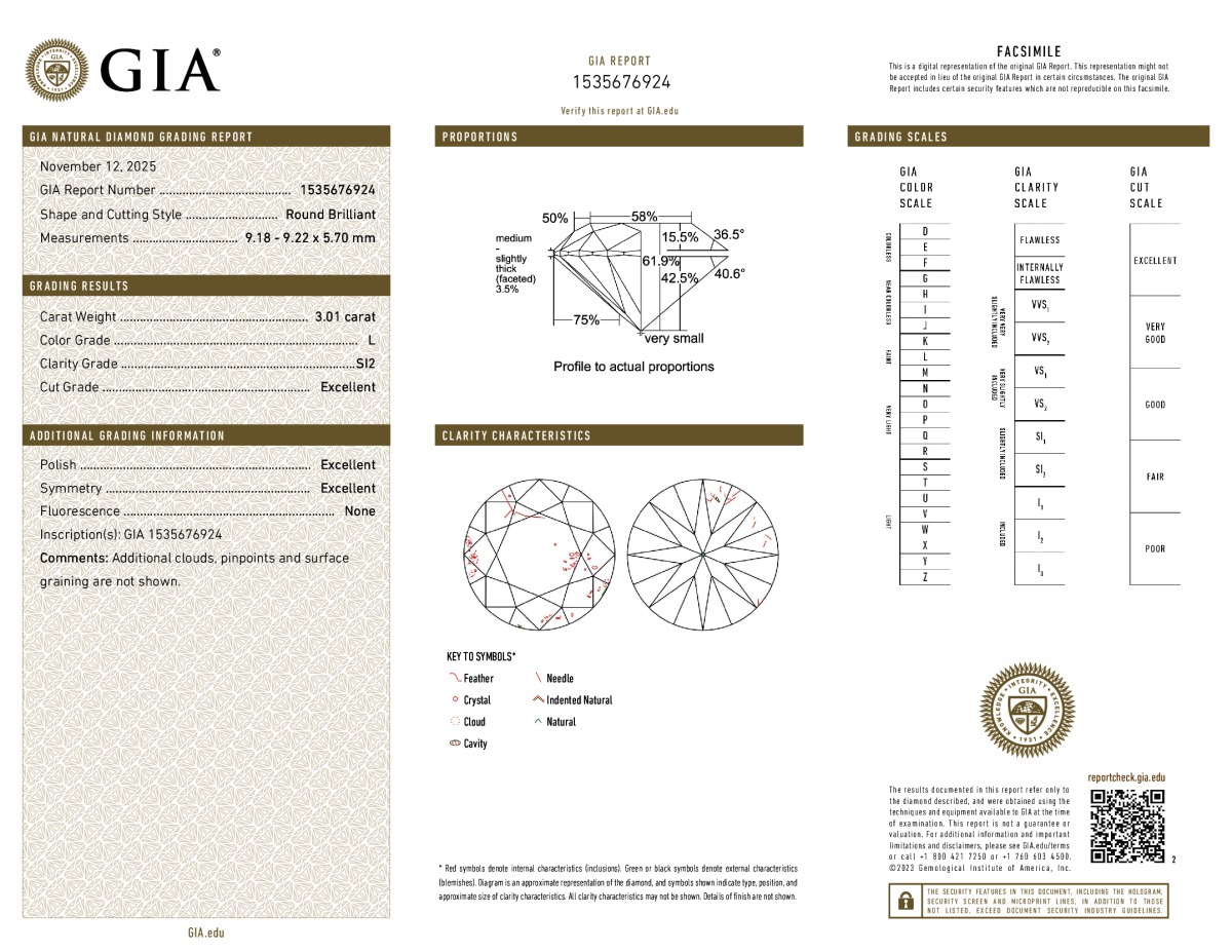 Round Shape, 3.01 Carat, L Color, SI2 Clarity